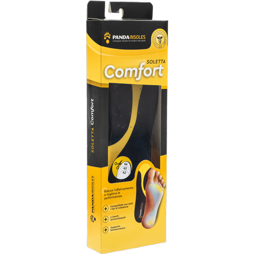 “Vložek “Comfort” je bil razvit z namenom enakomerne porazdelitve pritiska ter zagotavljanja olajšanja in podpore pri vsakem koraku, zato je priporočljiv za preprečevanje najpogostejših simptomov bolečine v stopalu. Anatomski profil v kombinaciji z delovanjem treh posebnih blažilnih vložkov, nameščenih na najbolj občutljivih mestih, zagotavlja udobje in dobro počutje stopal, kolen in hrbta. Vložki COMFORT so zasnovani popolnoma anatomsko in so idealni za preprečevanje bolečin v hrbtu. Pomagajo ohranjati optimalno držo, saj podpirajo stopalo v fazah dotikanja, nameščanja in odrivanja ter tako omogočajo fiziološko pravilno gibanje; posamezne velikosti notranjega podplata lahko prilagodite tako, da skrajšate njegovo konico glede na oznake na njegovi spodnji strani