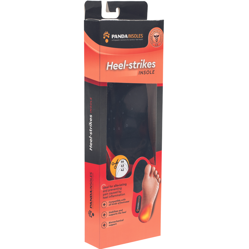 “Vložek “Heel-strikes” se priporoča za izboljšanje udobja stopala v čevlju, za preprečevanje ali lajšanje bolečin v zadnjem delu stopala (vnetje pete) pri uporabnikih, ki so še posebej izpostavljeni prevelikim obremenitvam pete. Inovativna zasnova združuje delovanje blažilnega vložka “Extra-Soft-Absorber”, nameščenega na višini pete, z delovanjem drugih dveh vložkov “Memory Foam”, kar ugodno vpliva na dobro počutje stopal, kolen in hrbta. Vložki HEEL-STRIKES so bili posebej zasnovani za zmanjšanje napetosti v predelu pete. S skupnim delovanjem treh vložkov, ki blažijo udarce, ohranjajo poravnavo stopala in gležnja v optimalnem položaju; posamezne velikosti notranjega podplata lahko prilagodite tako, da skrajšate njegovo konico glede na oznake na njegovi spodnji strani.