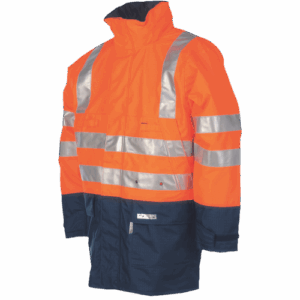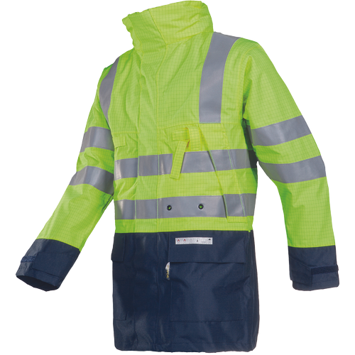 – večplastna, vodoodporna, visoko zračna in kemično odporna jakna HI-VIS z integrirano kapuco – zunanja tkanina SIOPOR združuje antistatične lastnosti z odpornostjo na toploto in ogenj, negorljiva bombažna podloga – 5 cm odsevne črte FR, ki zavirajo gorenje – zatesnjeni šivi – 2 sprednja žepa, 2 prsna žepa, 1 notranji prsni žep