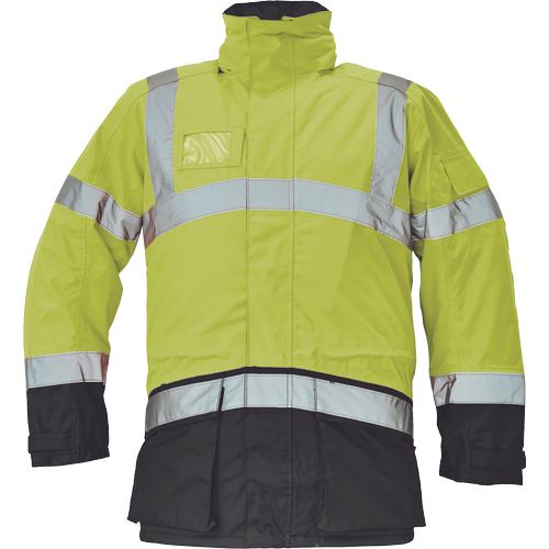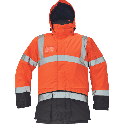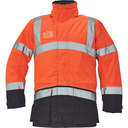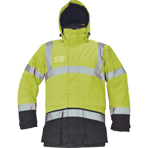 – moška zimska jakna HI-VIS, vodoodporna in zelo zračna – zunanja tkanina impregnirana s PU, visoka odpornost proti raztrganju – odsevne črte na ramenih ter okoli prsi, bokov in rokavov – 2 velika sprednja žepa, reža za osebno izkaznico, 1 žep na levem rokavu – nastavitev robov rokavov na velcro – primerna za tiskanje in vezenje