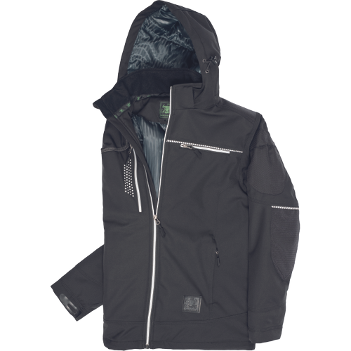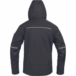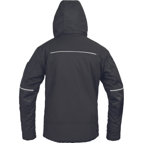 – moška zimska softshell jakna modernega kroja – odsevna zadrga spredaj na sredini – prsni žepi z odsevno zadrgo na levi strani s skritim jezičkom z imenom – na desni strani z odprtino za slušalke na notranji strani – ojačitev iz Cordure na ramenih in komolcih – prekinjene signalne cevi in signalni obliž za varnost in učinek – kontrastni šiv svetlo sive barve – kapuca z zadrgo – stranski žepi z zadrgo v prednjem delu – fiksna prešita podloga