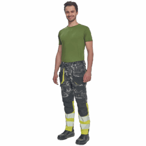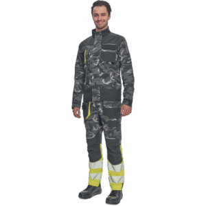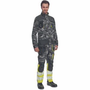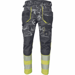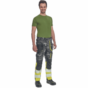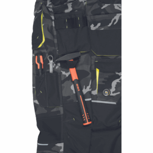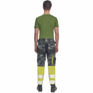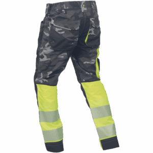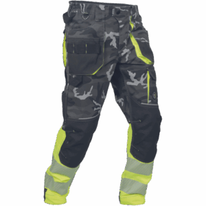 – moške delovne hlače HI-VIS z elastičnim pasom in večnamenskimi žepi – ojačitev kolenskih žepov Oxford 600D za vstavljanje kolenskih blazinic – trpežni trojni šivi na nogah in mednožju – odsevne cevi, spodnji del noge s 7 cm odsevnimi potiskanimi in segmentnimi črtami – sodoben maskirni tisk – podaljšana dolžina nog
